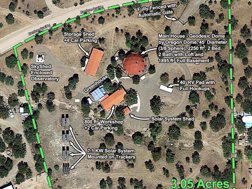 Amazing piece of property in lovely Mimbres mountains. Home is a geodesic dome by and comprises 3 floors with a full basement and elevator. The top 2 floors are 2250sf and have a loft accessible by spiral staircase or elevator. 2 bedrooms, each with it's own full bath. Big main room with window seats, by big, double pane wood windows offer spectacular views of the valley. The walk-out basement adds an additional roomy 1895sf of storage space with shelving, walk in safe and also accessible via the elevator. Metal shake roof will most likely never have to be replaced or even worked on. Outside, cement sidewalks lead to the various outbuildings which house a 800sf workshop and ample covered parking for many vehicles. A full hookup 40' RV pad is included. A 7.1kw Solar system mounted on trackers feeds the grid and house with its own electric shed. 400' well with excellent water. Rotating observatory with mounted 8' telescope conveys to lucky new owner.