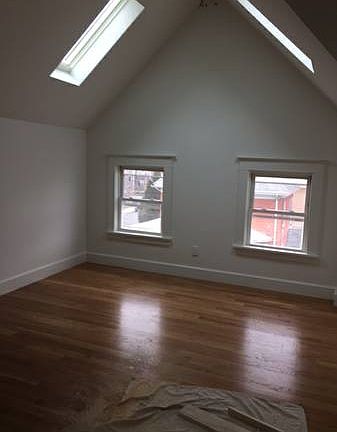 Excellent location, 10 minute walk to Davis Square on the bike/walk path. Enjoy the holidays in this spectacular two bedroom, one bath two story unit in a lovely three family. Located on a corner lot with off street parking, new construction unit features skylights, LED track lighting, European fixtures and appliances, brand-new wood floors, and an arresting architectural space. New gas heat/AC unit. Unusually large deck with a over the treetop views, laundry in the basement. 2475/mo.