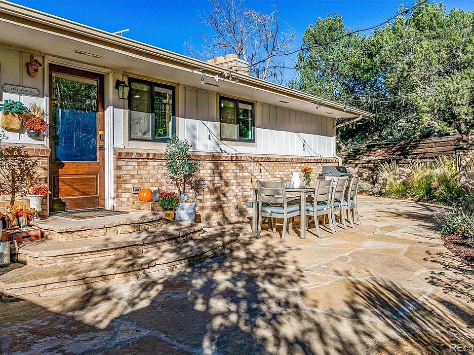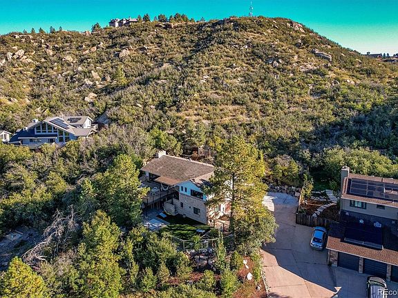 Charming ranch-style home is nestled at the end of a tranquil cul-de-sac, boasting a spacious lot of just under ¾ of an acre. The property offers breathtaking views & unparalleled privacy, w/vistas that encompass Pikes Peak & Devils Head. If you have a passion for the outdoors & enjoy entertaining or spending quality time w/ family, this property is sure to capture your heart. Surrounded by natural beauty, rock formations, scrub oak, & trees, this home seamlessly blends the indoor & outdoor experience w/a wall of panoramic doors, granting access to a composite deck w/sweeping views. Stylish great room is a welcoming space, adorned w/vaulted plank ceiling accented by a faux beam, plank tile floors, & a cozy brick wood-burning fireplace. Natural light floods the room, making it perfect for gatherings. The remodeled kitchen is a highlight for those who love to entertain. It boasts a center island, trendy pendant lighting, plank tile floors, granite countertops, gas range, tile backsplash, soft-close drawers, open shelving, & farmhouse-style sink. Dining room can easily accommodate a sizable table. Primary suite is a retreat, tile flooring, stunning views. Ensuite bath accessed through charming antique wood double French doors, steam shower, & double sink. 2 addit'l bedrooms on the main level offer overhead lights & tile floors. Full bath on this level includes a unique custom double trough cement sink & privacy door to jetted tub. Convenient main-floor laundry room completes this level. Walkout basement offers two bedrooms, rec area, & 2 storage areas. The ¾ bath features a wood block vanity w/vessel sink. Walk out to the patio & enjoy low-maintenance artificial turf & garden boxes for growing vegetables & spices. Relax in the private courtyard & firepit area, or hike up the hill behind the home to create your own seating space w/panoramic views. Deep 2-car garage, spanning 550 sqft. A unique blend of indoor comfort & outdoor serenity.
