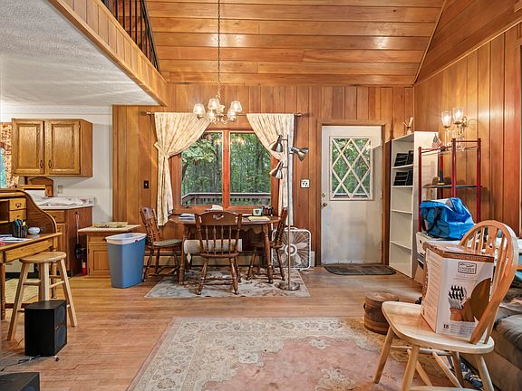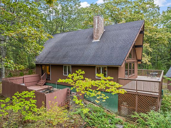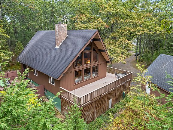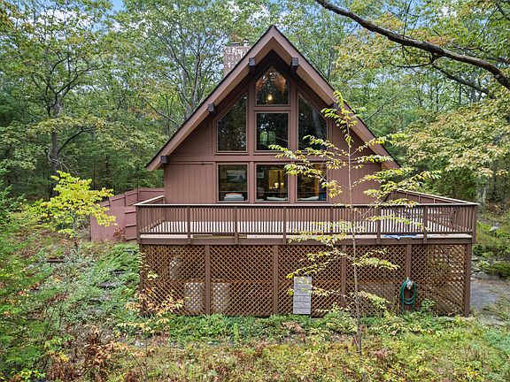 Nestled in the woods, this well-built post-and-beam chalet blends timeless character with thoughtful updates. A freshly painted exterior and large composite deck create an inviting space to enjoy the peaceful setting. Inside, a dramatic two-story stone fireplace—now gas—anchors the open living area, while soaring windows flood the home with natural light and tranquil wooded views. The loft provides flexible space for an office, family room, or extra sleeping area, and the primary bedroom opens to a private serenity garden. A drilled well (2013), newer shower system, 2018 storage shed, and included furnishings add comfort and convenience. A rare retreat with rustic elegance and modern ease.