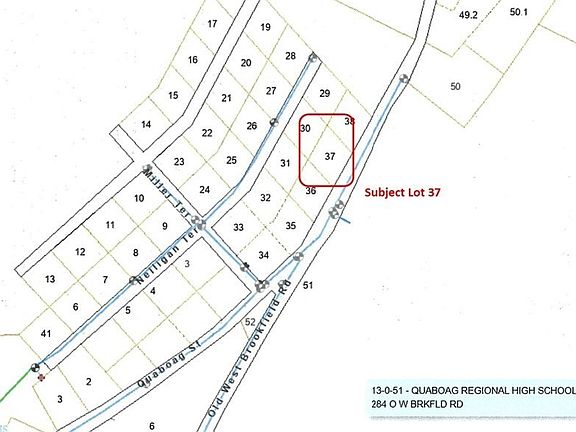 .46 Acre lot across from Quaboag Regional with water at street. Part of the original "Memorial Heights" development and the lot is zoned "Village". Property slopes up from the road with a stone wall along much of the 150' of street frontage and is wooded with a home on either side. A water line Right of Way is located along the eastern side boundary. Being sold "as is" and buyers are responsible for verifying all information and any lot testing/permitting.