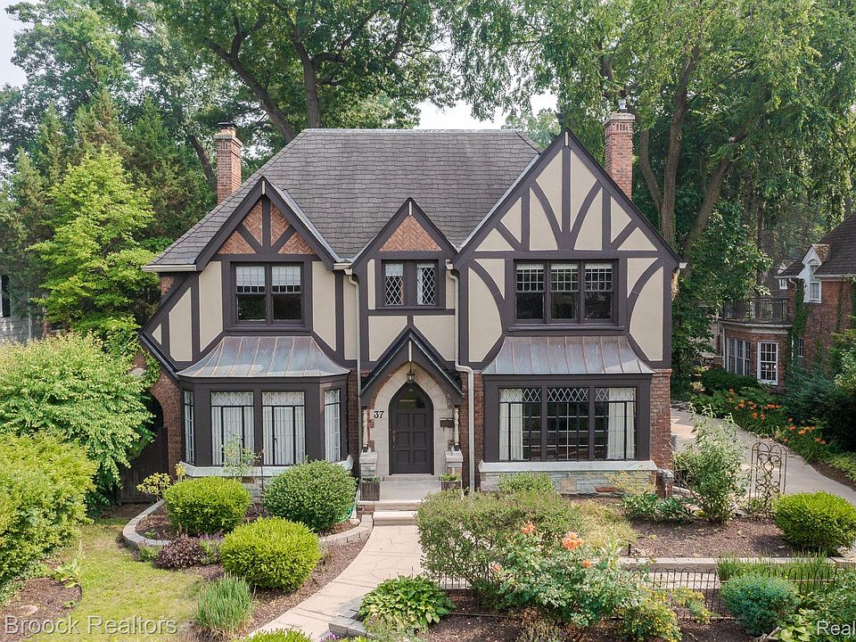 ***Highest and Best Thursday 7/13/23 @ 9 PM*** Welcome to this impressive Tudor home, located in the highly sought-after Pleasant Ridge neighborhood. As you step inside, you'll be captivated by the charm and character this historic residence offers. The striking leaded glass windows allow natural light to fill the rooms, creating a warm and inviting atmosphere. The main level features a spacious living room with a cozy fireplace, perfect for relaxing evenings. The foyer space adorned with Pewabic entry tiles adds to the character of the main floor.The formal dining room is ideal for hosting elegant dinner parties, while the sunroom provides a serene space to unwind and enjoy the views of the beautifully landscaped backyard. The kitchen boasts newer coffee-stained maple cabinets, a Viking stove, granite counters, and maple flooring, offering a delightful culinary experience. Adjacent to the kitchen is a breakfast room, providing a casual dining area for everyday meals. A convenient first-floor lavatory adds to the functionality of this level. Prepare to be amazed by the dramatic and wonderful stairwell, adorned with exquisite leaded windows, leading you to the upper floors. The fifth bedroom, originally designed as maids' quarters, offers versatility and can be utilized as a guest room or home office. The loft-style third floor is a unique space with skylights, allowing abundant natural light to pour in. This area presents an excellent opportunity for a studio, playroom, or additional bedroom. A recently renovated bathroom, along with a second-floor laundry and office space, cater to modern-day needs and provide convenience for everyday living. The newly refinished basement adds additional living space, complete with a full bath and ample storage options. The backyard is a haven of tranquility, enveloped by beautiful mature trees and lush greenery. The professional landscaping adds a touch of elegance to the already picturesque setting.