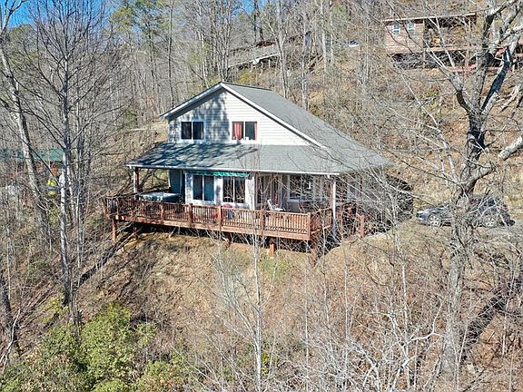 Room with a view, this well constructed home is built so that you have a mountain view from most every room, each season is a new view. There is a great deck along the front of the home, and covered porches. Open living area with big windows so you can enjoy the views. A vaulted ceiling in the living room with large window gives you lots of natural light, plus a gas log fireplace. There is a spacious bedroom down stairs with glass doors that open onto a covered deck. The stair way takes you up to a loft area, a second bathroom, and a second bedroom. The upper bedroom is spacious with windows for enjoying the views. This is a beautiful home. There is a storage shed with the home. Located near Fontana Lake in the Pelohi Cove community. Just a short drive into downtown Bryson City. Measurements for kitchen and dining room are combined. Pelohi Cove Subdivision does not allow short term rentals.