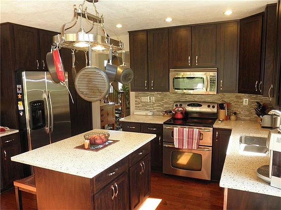 Brick 4 Bedroom, 3 Full, 2 Partial Bath property features updated and refinished kitchen, vaulted ceiling extending from family room through to breakfast area overlooking deck, back yard & side yard pond. First floor master bedroom with en suite bath, tub and separate shower. Additional first floor features include partial guest bath, laundry, family room with log burning stone fireplace, hardwood floors and vaulted wooded ceiling, formal dining room and office area. Second floor features generous 17x14 second bedroom with partial bath, second full bath and two smaller bedrooms. Hallway overlooks family room. Lower level includes current exercise room, stone and tile full bath with shower and sauna, finished game room and wet bar area.