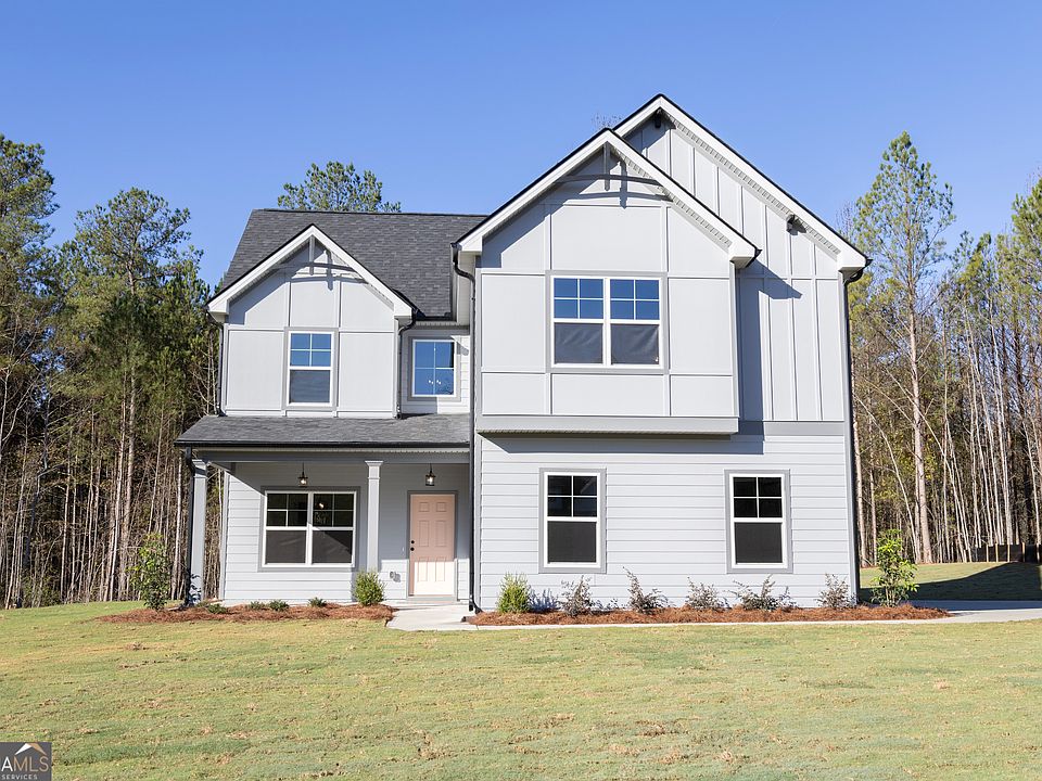 Bismarck A - 4 beds, 2.5 baths. Brand new subdivision called Piney Woods in the Newnan area. Walking into the home the foyer is welcoming and there's a coat closet and linen closet for storage. The Kitchen looks into the Breakfast Area and is connected to the Dining Area. The Kitchen features stainless steel appliances. The large Family Room has a woodturning fireplace. Also a half bath on the main floor. Upstairs, the large Master Bedroom has TWO walk in closets and a full ensuite with double vanities and a separate tub shower. Three additional bedrooms, one full bath, and the laundry room are also upstairs. One Acre Lot