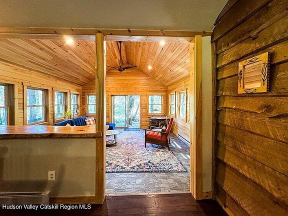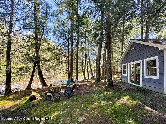 This cabin in the woods was upgraded to a year round dwelling with two large additions: The first a spacious pine-paneled living room with cathedral ceiling, wood stove and glass sliding doors looking out at the woods and Neversink River in the back. Stairs lead up to a generous loft. The other is a light-filled sunken sunroom, with 3 sides wrapped in windows. Another glass slider allows for year round water views. It also provides easy access to the back of the house, where soaring pines with high canopy blanket the ground in needles. It is where owners and their guests gather around a crackling fire, share their stories and are bathed in the calming sounds of the river. The basic country kitchen is roomy and includes a corner for dropping gear, while a staircase leads to a deep loft that could easily serve as a fourth bedroom or office space. A short hallway off the kitchen leads to 2BRs and a bathroom. And then there is the river, whose calming presence can't be over-stated.