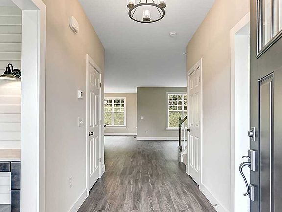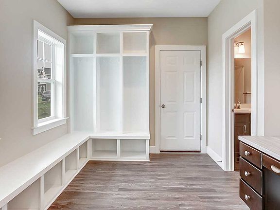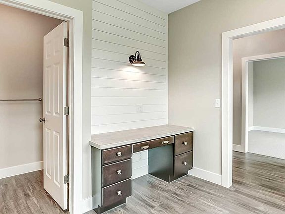 This 2-story home with welcoming front porch includes a 2-car garage.. The spacious mudroom entry features convenient lockers with bench, a built-in desk with shiplap accent wall, and a full bathroom. The 1st floor boasts 9' ceilings, open living spaces, and a flex room to the front of the home that could serve as a study, living room, or other flexible living space. Stylish vinyl plank flooring foyer extends to the mudroom, kitchen, dining area, and great room. The open kitchen includes quartz countertops with tile backsplash, an island with breakfast bar counter, attractive cabinetry with decorative crown molding, and stainless steel appliances. Off of the kitchen is the great room, warmed by a cozy gas fireplace with stone surround and shiplap detail above the mantle. The sunny dining area provides access to the patio and backyard. In addition to the bedrooms and full bathrooms on the 2nd floor is a laundry room and a spacious rec room. The owner's suite includes an expansive closet and a private bathroom with 5' shower and double bowl vanity.