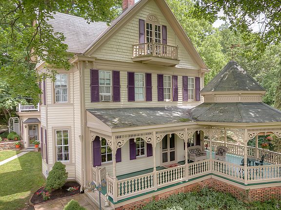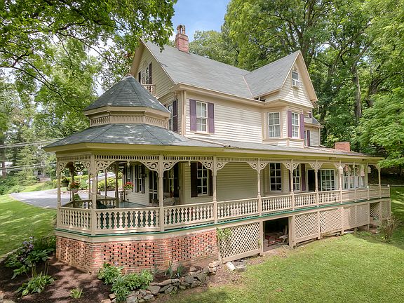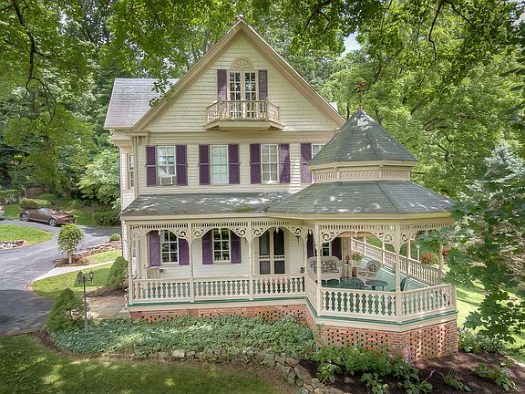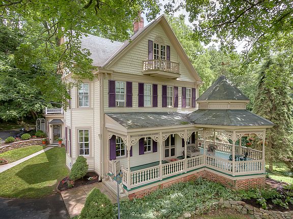 Charming home with gingerbread gazebo wrap around porch. 5-6 bedrooms with 3 full baths. Kitchen with sunroom, fireplace, cath ceilings and walk in pantry. 1.8 acres backing to 6 acres of county land. Separate garages with parking up to 9 cars.High ceilings, arched doorways. Full attic loft apartment(kit,jacuzzi,wic,balcony. Bay windows.Central Air! Priced below appraised value.