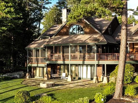 Custom Adirondack style lakefront home located close to Meredith Center, 230' of private lake frontage on Meredith Bay with Southwest exposure for incredible sunsets. Property features main lakeside home and detached 1590 sf guesthouse with 2 additional bedrooms and 1 1/2 baths. Lakeside home has 5 bedrooms 5 1/2 bathrooms, 1st floor primary suite, 2nd floor primary suite with sitting area & stone fireplace, 3 additional en-suite bedrooms for a total of 5. Finished walkout lower level to lake with exercise room, theater and large family room & fully applianced bar with spectacular water/sunset views. Fieldstone fireplaces, custom Adirondack finishes makes this a Winnepesaukee masterpiece! Both properties have their own, septic, well, central ac & heat, and automatic whole house generators. Showings begin 2/10/23
