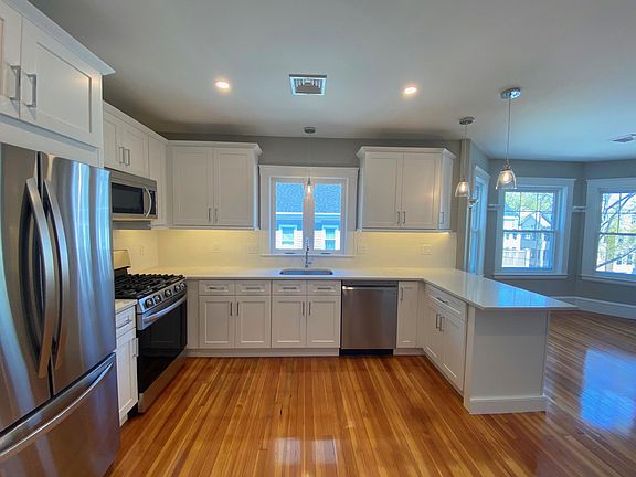 Brand new renovation with the Watertown Luxury tenant in mind. 3 Bed, 2 full bath on the top two levels of a beautifully maintained 2-family home. Brand new kitchen with gorgeous quartz counter tops, stainless steel appliances and custom cupboards. Open-concept kitchen complete with peninsula for bar stool seating leading to the dining room and living room with custom window seat bench and fireplace. Private front porch outfitted with new patio furniture to stay. 2 bedrooms and full bath on the main level with your top floor boasting private master suite with brand new bathroom. Gleaming hardwood floors were just refinished. Fresh paint everywhere. Brand new lighting. Gas heat. CENTRAL AC. Laundry in-unit. Pets ok! Brand new landscaping and patio with complimentary grill to use. Garage and off-street parking. On tree-lined Spruce St in Watertown, this quiet neighborhood is perfectly located close to Cambridge, Belmont, Newton and into Boston. This unit truly has it all!