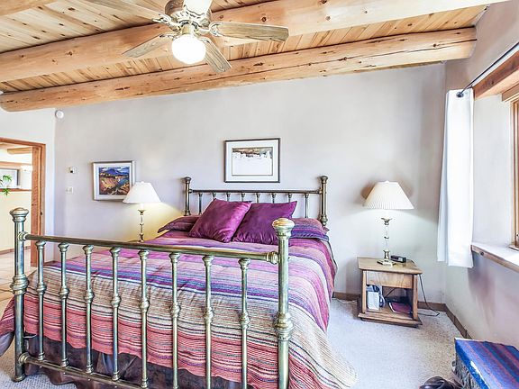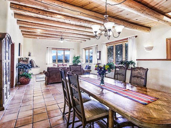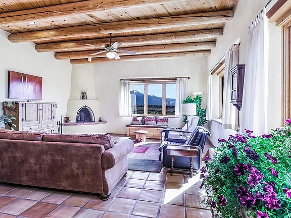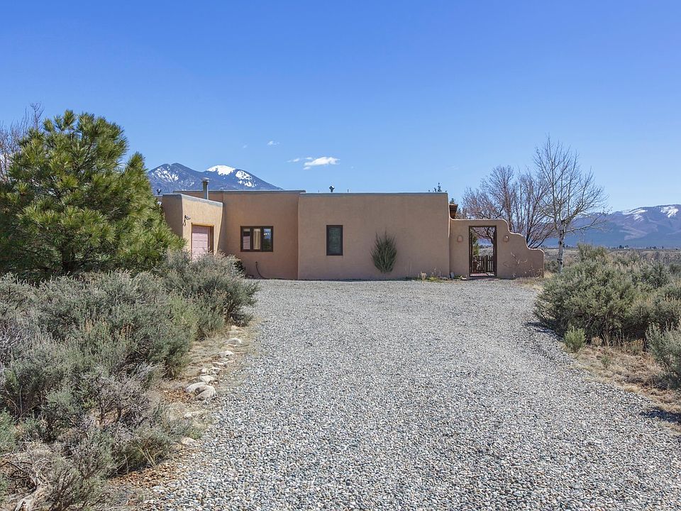 Enjoy 360 views from this spectacular hilltop adobe home that sits on your own 3.5 acre compound and includes a charming casita. Native plants, peach, pear, and aspen trees line the garden path entrance to this exquisite home. Pass through the antique Mexican hand-hammered doors that frame snow-capped mountain views. The gracious dining area seats 10 or more guests and opens to 10 foot tall ceilings in the living room. Sit by the lovely kiva fireplace to take in the sunrise through east facing picture windows that wrap to the south for all day sunshine and Sangre de Cristo mountain range views. Oriented at 15 southeast, the home is perfect positioned for passive solar gain. The kitchen includes a stainless refrigerator and range and offers western facing views of Tres Piedras. There is even a charming dining nook for two. The gracious south-facing 20 x 20 primary suite includes his and her closets and the ensuite bathroom includes a double vanity. Two large guest rooms, each with a priceless eastern view, share a nice size bathroom. Enjoy outdoor entertaining on the covered portal and soak and in the spectacular mountain views. A private walkway leads to a straw bale construction casita. This open studio with polished cement floors and a small kitchenette is perfect for guests or renting out on Airbnb. The furniture in the casita conveys at closing, so it's a turn-key rental opportunity. Should you choose to enlarge the casita, there is an attached artist/work studio for an additional 400 square feet of flexible space. The home includes an attached, heated, one-car garage, an attached carport and plenty of space in the gravel driveway for guest parking. There will be a new color coat on the casita, new gutters, and a new roof was installed 2021 to make this a real treasure