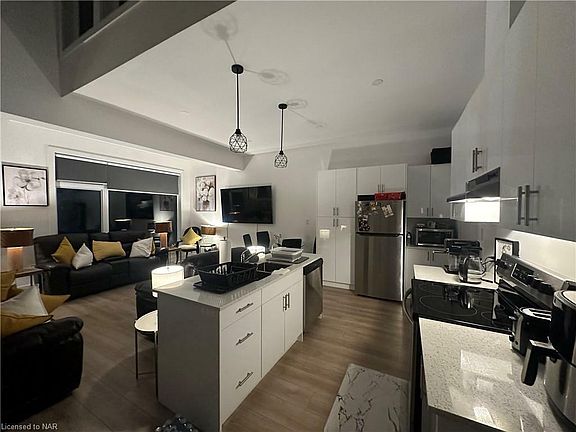 Here is your chance to enjoy living in Fonthill in this 2 bedroom, 2 full bathroom townhome with garage and third level Belvedere and outdoor terrace to enjoy all year round. This home was built in 2022 with fine finishes and offers all appliances for your use. Soaring 14' ceilings make the space feel large and open on the middle level with the open concept kitchen and living area. There are stainless steel appliances, quartz counters and an island with modern cupboards to enjoy. The main entrance level offers 10' ceilings, the laundry area, inside garage access and one bedroom with full ensuite. The second bedroom is on the middle level with ensuite privilege. You will love being able to walk to all amenities - groceries, shopping, restaurants, library, parks, the Meridian Centre for indoor activities, Steve Bauer walking trail and so much more that Pelham has to offer! Brock University and Niagara College are a short drive away with easy highway access from this location. Nothing to do but move in and enjoy this new community. Looking for AAA+ tenants and will consider short term rental as well.