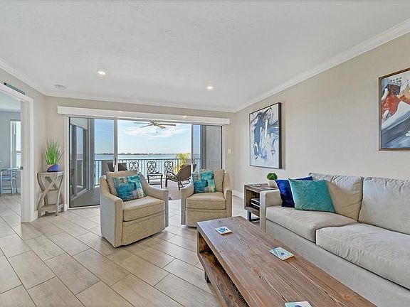 Gorgeous views overlooking Sarasota Bay, with your own private beach. Turnkey annual furnished rental includes everything except electric and internet. Just a short stroll to the vibrant downtown arts, culture, award-winning local dining and more. As you enter this spacious over 1,500-square-foot home, you will be drawn to the stunning views of the bay. This rarely available three-bedroom, two-bath end-unit condominium is ready for you, just bring your toothbrush. This lovely home has been given a fresh makeover from stem to stern with stainless steel appliances, granite countertops and wood cabinetry in the kitchen, new baths, all tile throughout, and contemporary furnishings to make this the place to call home. The primary bedroom has a king bed, ample closet space and an updated bath. The second and third bedrooms have queen beds and the guest bath is also updated. One covered parking space along with plenty of guest parking.