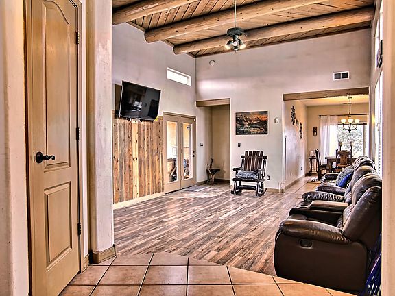 BACK ON THE MARKET! Fantastic home, great floor plan; master bedroom separate from other bedrooms. Gorgeous new laminate wood flooring in living area. Wood burning stove with rock accents! Huge living room with lot of windows and natural light, super tall ceilings, and great wood accents! Gorgeous wood beam ceilings. County kitchen with stainless steel appliances, (except refrigerator and microwave) beautiful cabinetry. All bedrooms are spacious. Large master bedroom with new laminate wood flooring, master bath complete with jetted tub, custom wood accents, and separate water closet! Peaceful setting and location!