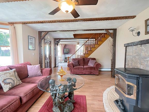 New price for the new normal! This multi-use zoned property offers 2 separate units or a Single Family with a spacious flowing floor plan! Main house offers breakfast bar in kitchen and cozy pellet stove in Living Rm! Lots of natural light & replacement windows throughout! Upstairs you'll find good size bedrooms off of balcony staircase with Lg Full Bath open to Master Bdrm w/walk in closet. Attic space off master bdrm is insulated and ready to be finished. Finished walk out basement has Laundry Rm with sink & a 3/4 Bath. Unit 2 has access through main house hallway and has 2 entrances/exits & 3/4 bath; easy conversion back to in-law or studio apt. Ideal for multi generational living, a home office or in home business! Beautiful sprawling yard with AG Pool & Pergola! Lots of storage & Workshop in basement! Top it off with 5 yr Young Roof, Wired in Generator PLUS 30x30 Garage! Separate driveways! Close to MA Pike, Rt 9 & 20. Strict COVID protocols; Masks & signed Covid disclosure req.