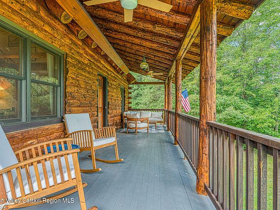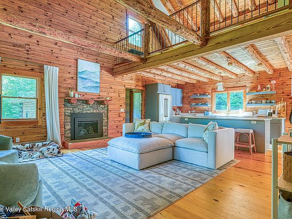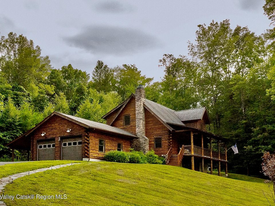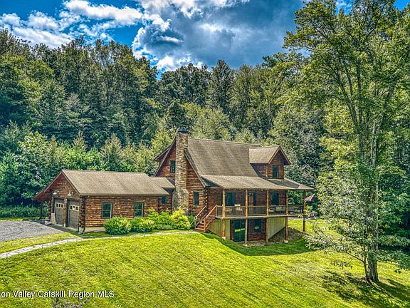 Nestled on just under 3 acres of picturesque Catskill Mtn countryside, this fully renovated contemporary log home offers a seamless blend of rustic charm & modern luxury. All the hard work and planning has been done for you. Newly remodeled interior boasts a brand new kitchen, equipped w/ solid wood cabinetry, Thermador appliances, & elegant solid surface quartz counters. The blend of Kohler & Restoration Hardware finishes, along w/ high-style Mitzi lighting, creates a perfect harmony of form n function. Extensive time and money was invested into making this a completely turnkey offering. Refinished wood flooring compliments the log structural components & other updates throughout. The open plan welcomes you into the 2 story vaulted ceiling living room, which is well lit & airy. The primary bedroom is conveniently located on the main level & features an ensuite full bath w/ tiled shower, providing a private spa-like retreat within your home. Completing the main level is a 1/2 bath & laundry area for your convenience. Upstairs offers an additional hangout/flex space for relaxation or entertainment. 2 additional beautifully appointed bedrooms & a full bath upstairs offer ample space for home office, family or guests. A full walk-out basement is ripe for transformation, potentially adding an additional 1,000 sq. ft. of living space, tailoring the home to fit your needs perfectly if desired. The attached large 2 car garage w/ high ceilings is currently being used as a workout/fitness area, showcasing the versatility of this property. The exterior is equally impressive, featuring a full front rocking chair porch where you can enjoy your morning coffee while taking in the serene surroundings. Back deck & newly created patio/fire pit area provide perfect spots for entertaining after a day of exploration. For those with a passion for trending sports, the beginnings of a pickleball court await your finishing touches. This exceptionally sited home is set far back from the road w/ an expansive front lawn, provides a sense of seclusion and privacy that isn't easy to come by these days. Fully enclosed w/ split rail & invisible deer fencing, children & pets will surely enjoy the extra freedom to explore. W/ an oversized 2.85 acres, there's a nice mix of sunny lawn & woods, creating a perfect balance of open space & natural forest. This home goes far beyond its stunning visual appeal w/ its extensive list of proactive, under-the-hood maintenance & upgrades. Exterior log staining/sealing, driveway resurfacing, & comprehensive plumbing n electrical improvements ensure that every aspect of the home is in prime condition. W/ modern conveniences such as a Tesla charger, fresh interior paint, & 4 new Mitsubishi split units, you can move in w/ peace of mind & start enjoying your home immediately. The inclusion of a home monitoring system & generator further enhance the worry-free lifestyle this property offers. Situated on an ultra-quiet town-maintained dead-end road, this modern log cabin offers a serene escape from the daily hustle n bustle. Nearby attractions such as Inness, Arrowood Brewery, Westward Orchard, Kelders & Saunderskill Farms provide a rich array of activities & experiences. Quick access to Mohonk Preserve & Minnewaska State Park ensures endless opportunities for outdoor adventures & connecting w/ nature. Whether you are looking for a full-time residence or a weekend getaway, this property provides the best of both worlds. The AAA location & proximity to endless outdoor activities make this a rare find in today's market. At a time when inventory is still near historic lows, finding a turnkey home in such a coveted location is a uniquely limited opportunity. Don't miss your chance to own this thoughtfully renovated contemporary log cabin in one of the most sought-after regions in upstate NY. Under 2 hours from Manhattan.