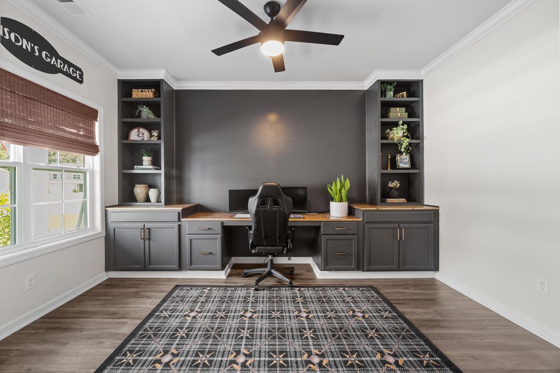 Fully fenced backyardLarge islandSpacious open floor planCustom detailsBuilt-in desk and bookshelvesStainless steel appliancesBamboo blinds