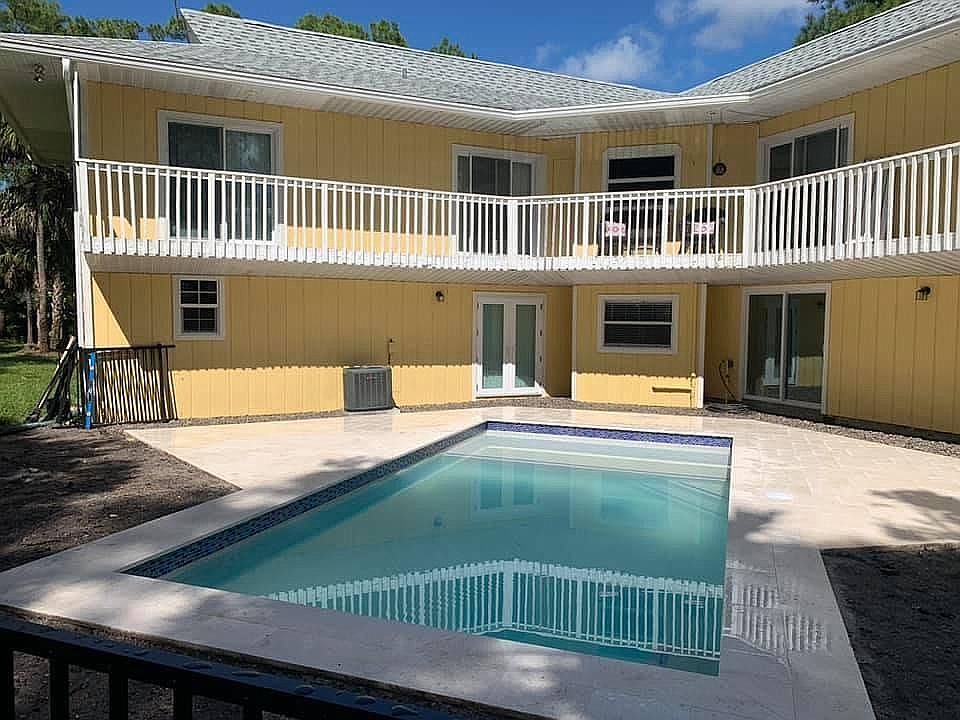 Over 3000 square feet, this two story home is nestled in Golden Gate Estates offering privacy and serenity with loads of tropical plants blanketing the landscape, including producing banana trees. Two separate homes. The main living area on the second floor renovated in 2015 features two large bedrooms each with walk-in closets and full baths. Upstairs A/C installed April 2020. Spacious dining room and living room, breakfast bar in the kitchen as well as wrap around porch and granite throughout. New Monitor style horse barn 48x52x14 Built in 2020. New roof and gutters September 2020. New pool with built in sun ledge and travertine decking built Oct. 2021. First floor, newly renovated in 2018 features a separate entrance mother-in-law suite with full kitchen, living room, master with walk-in closet and additional bedroom. This home also features an additional entrance into office space and storage areas, all under A/C. Plenty of square footage inside and out, a must see. Close to schools, Publix, and Walgreens and West of Wilson Blvd with room for a pool.