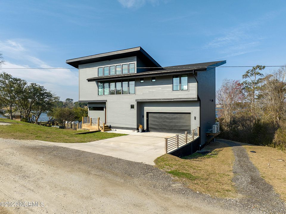 Waterfront Custom home on Virginia Creek in Hampstead and only 5 min from the Beach. This home brings a modern feel to our traditional coastal architecture. The spectacular views, custom features, deep waterside open decking, and boat slip with boat lift create the perfect place to call ''Home''. This home features 3 bedrooms, 2.5 baths, office, gourmet kitchen, open concept living dining combination and additional sitting area upstairs. Kitchen includes Thor 48'' gas range, Fantasy Brown dolomite counters, beverage chiller, bar side seating, water views, custom cabinetry, and pantry off the laundry room. Full length decking off of the main living area adds a great deal of additional space for summertime dining, entertainment and wildlife viewing. Upstairs find 3 cozy bedrooms, each with it's own view of the water. The main bedroom includes an 8x8 walk in closet, full length waterside windows with double sliders opening up to the upper level deck and large private bathroom with glass shower, water closet, dual vanities, stand alone tub and linen closet. 2 additional bedrooms, guest bath, office and sitting area complete the 2nd level. Custom Poplar wall shelving enhances the indulgent feeling of original hand made wood accents. Other upgrades include under cabinet lighting, festoon lighting on the deck and over 165 can lights for exceptional lighting in the main living areas. Location is a few minutes from Surf City beach and local conveniences.