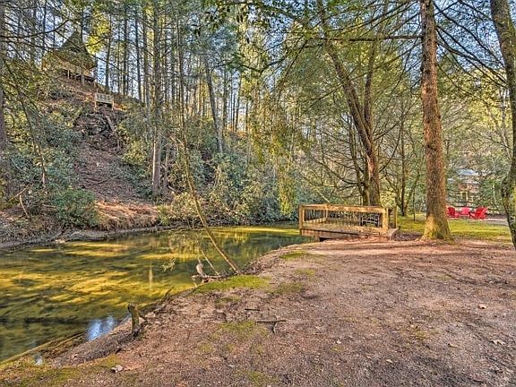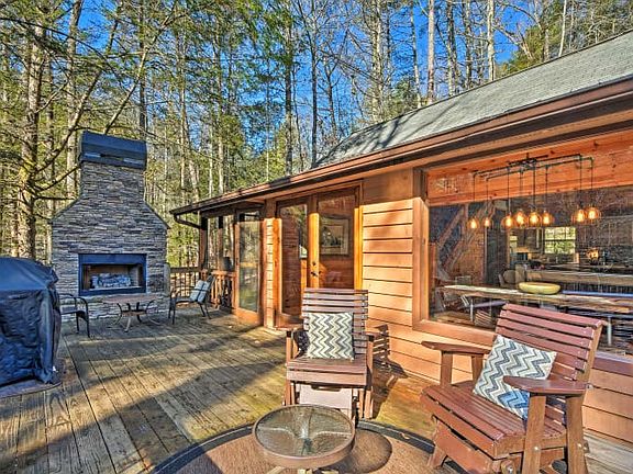 1BR + Loft, 2BA, with 150' level frontage on Fightingtown Creek! Exquisitely renovated with stunning, modern kitchen, open great room with fireplace. Selling Turnkey! 14 Minutes to downtown Blue Ridge. Master on main with private screened in sitting porch that opens to a large outdoor deck. Separate large master bath with beautiful tile and large glass shower. Loft bedroom has built-in bunks, a double and a separate twin with attached large bath including a walk-in tiled shower. Outdoor deck has a large fireplace and plenty of room to enjoy a meal, read a book, and enjoy the sights and sounds of the creek. Steps lead down to the hot tub for the ultimate in relaxation. In addition, a large sitting deck is located creekside. Grounds are well-kept, manicured, and low maintenance. Properties like this are few and far between with walk out access to the creek. The RENTAL HISTORY available upon request.