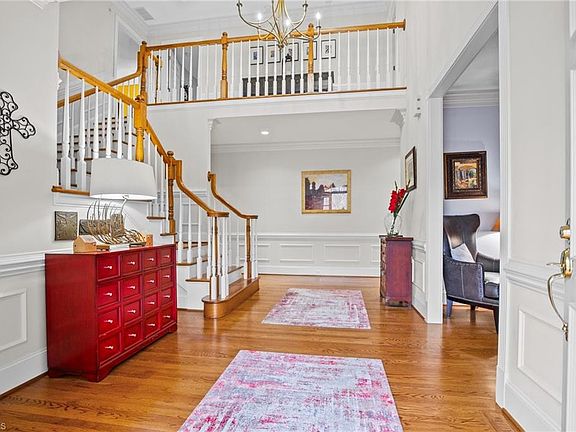 Rare Southern-style home nestled in prestigious cul-de-sac of custom homes. Stunning exterior features U-shaped drive, spacious lots and trees, and tree-lined street enhancing charm of area. Interior showcases craftsmen woodwork and striking staircase as centerpiece of foyer. With nearly 4,400 square feet, this home boasts large chef's kitchen; generous counter space; wet bar with two beverage coolers. Enjoy morning coffee in sunroom. Other highlights include dedicated office, flex space and cozy frog room for relaxing. Ample storage. Two patios overlooking expansive yard that transforms from bare winter look to lush park like setting come spring! Relax on extended covered front porch and wave to the friendly neighbors. Lovely neighbors and neighborhood!