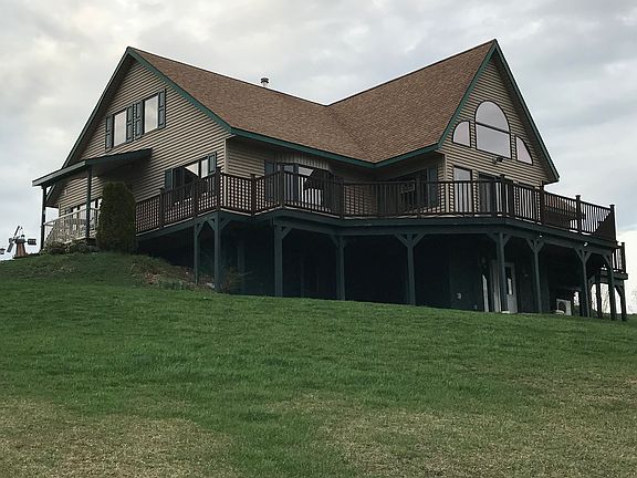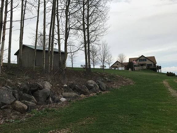 A great home in a great location, with a grand view. This beautiful home has cathedral ceilings and second floor balcony overlooking the living room, with all window on first floor overlooking the valley. There is a full length deck looking out over the ponds, Large 60 x 40 pole barn, The basement in partially finished with full bath and double doors to the outside. For your comfort there are heated floors in the basement, and Handicapped accessible doors and bathroom, needs ramp 1 step up from garage.