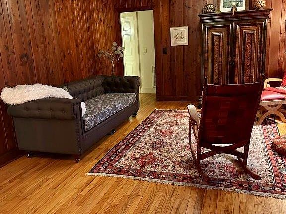 Brick cottage featuring hardwood floors, original native pine paneling in the living area, full kitchen (stove/refrigerator/dishwasher), natural gas HVAC (new 2023) & hot water, washer/dryer hookups, front patio, back deck & nice yard. 8' x 10' storage building. Easy walking distance to downtown Southern Pines dining, shopping, parks, and recreation. Easy commute to Ft. Bragg. Owner provides gutter cleaning service quarterly. Built in 1950. NO PETS NO SMOKING 1 YEAR MIN LEASE RENTERS INSURANCE REQUIRED