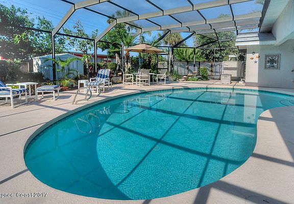 CONVENIENT INDIALANTIC! BEAUTIFUL POOL HOME ON 1/3 ACRE WITH A GIGANTIC BACK PATIO! JUST A SHORT WALK TO THE BEACH! Unique curb appeal, storage galore & luxury outdoor living is the running theme...formal living room, dining room, breakfast bar & spacious kitchen overlooking a family room w/beautiful natural stone fireplace! Fantastic pool views from most rooms plus a gigantic (14 x 40) screened pool/patio area for relaxing or entertaining! Some new appliances (2016) New pool pump (2016) New water heater (2016) Updated electric & wiring throughout. Large utility room, extra foyer space, over-sized garage w/attic storage, outdoor shed & very unique attic storage over patio area! Private walk to the front door w/tropical gardens surrounding you...ENJOY FLORIDA BEACHSIDE LIVING AT ITS FINEST!