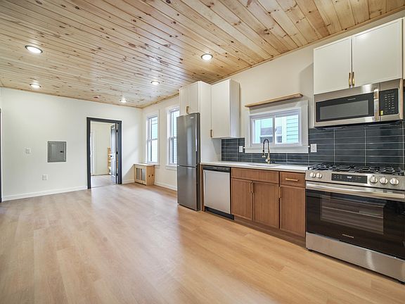 Situated on a quiet street of Jersey City Heights you will find this beautifully renovated 3 bed 1 bath apartment. The moment you walk into the apartment you are welcomed by the warm color tone and oak wood plank ceiling with a beautiful poly finish. Natural sunlight throughout gives this space an amazing feel. Custom built-ins in the bedroom closets as well as an Ikea armoire for additional storage. Walking distance to Leonard Gordon Park, The Hutton, City Bike, shopping and dozens of restaurants to choose from. There is common area laundry, shared yard, and storage lockers available on-site.**Rent price reflects net rent on 15-month lease, last month free. Gross rent $3100)