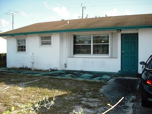 True 4 bedroom home with split bedroom plan, 2 bedrooms and bath on one side and 2 beds/bath on the other. So much potential for this light filled, family home. Great for first time home buyers or investors. Dining area off of kitchen with sliders to rear yard. Property is fenced front and back with room for up to 6 cars. Double Driveway on right of home and single driveway on left. Laundry room with Washer and Dryer accessed from rear of home - covered walkway - plus an additional storage room. Great sized rear yard with trees for privacy, room for a pool. Home is fully protected with mix of panel and accordian Hurricane shutters. Great location, between Federal Hwy and Congress Ave, close to shopping, Dining and Beaches