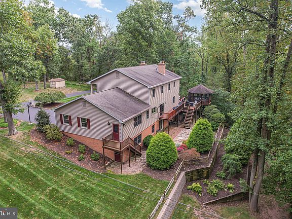 This magnificently appointed and updated home has been lovingly maintained for 37 years by the current owners. Step through the double door entry into the 2-story foyer featuring wood floors, a display ledge with railing and chandelier which can be lowered electronically. The formal living and dining rooms adjoin the foyer. Both rooms feature wood floors, chair rail and crown molding, and large bay windows for plenty of sunlight. Behind the pocket doors from the living room, you'll discover the stately library featuring walls adorned with rich wood panels and plentiful built ins. Of course, at the heart of every home is the kitchen and this kitchen will not disappoint. The spacious island offers a built in microwave and cooktop, Miele dishwasher, and seating for 2. The custom Wood Mode cabinets offer plenty of storage space and little surprises such as a hinged spice rack and also disguise the built-in Sub-Zero refrigerator and freezer. Preparing holiday meals for a crowd will be a breeze with the double ovens, one of which offers steam cooking, and warming drawer. Wood beam accents on the ceiling and tile backsplash add beautiful aesthetic touches. The breakfast room is nicely incorporated into the kitchen with the dining table extending from the island. The brick fireplace insert provides ambience and the custom-built hutch and built-in shelves provide even more character and warmth to this room. The family room, with it's ship lap walls and wood ceiling beam accents provides a casual gathering space for the family. The connected half bath is sure to impress with the granite top vanity and copper tone metal basin. With a private entrance, this room would also function well for a home-based business. The second floor offers four bedrooms. As your day comes to an end, let the relaxing two-tone rust and gold color palette of the primary bedroom suite envelope you as you settle in for a good night's rest. The ornate plaster ceilings found throughout the home are continued upstairs and the chair rail adds an additional finishing touch. The en suite bathroom features a double vanity and walk-in tile shower. Three additional bedrooms and the hall bath with tiered quartz vanity and Japanese soaking tub complete the second floor space. The walk out lower level provides an additional 1,107 finished living space. The large game room features a brick accent wall and wood ceiling beam accents. The bonus room features more built-ins and more ceiling beam accents. The laundry room includes plenty of storage and workspace for your favorite hobby as well as a utility sink for convenient clean up should your favorite hobby be on the messy side. The full bath in the lower level has a walk-in shower. With three separate entrances, the potential exists for this level to serve as a comfortable in-law suite. In addition to the finished space, the mechanical area also provides additional storage. There's plenty of space for outdoor entertaining on the tiered decks or simply sit and enjoy the views of your pristinely landscaped and wooded 1.3 acre lot. If you'd like even more land, there's an additional 1.5 acre lot that could be included for an additional price. The ceiling fan in the screened pavilion will provide an additional breeze as you enjoy a pest-free summer evening meal. Don't miss your opportunity to own this wonderful retreat in a small town country setting but just minutes away from dining and shopping amenities.