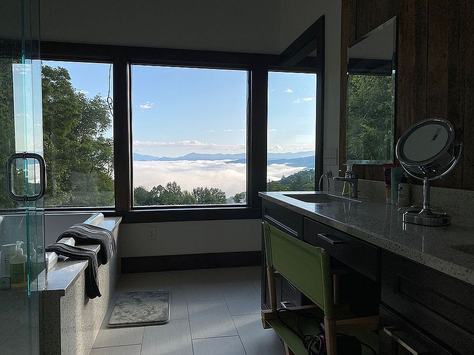 Architect designed, modern cabin with high ceilings and superb multilayered mountain views year round. Interiors are modern-rustic. Main level is open design with a gorgeous stove fireplace that efficiently heats the home, despite also having central heat and a/c. Bathrooms have luxurious heated floors.