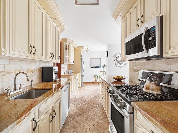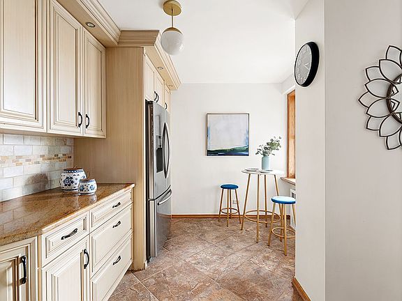 Airy and flowing, with an oversized, windowed kitchen renovated in a Tuscan modern style with a travertine mosaic backsplash and granite kitchen countertops. Let your inner chef fly with a pleasurable excess of cabinet and counter space, stainless steel appliances including a Bosch dishwasher and LG refrigerator and 2 seating areas, a breakfast bar and cafe area, with which to enjoy the fruits of your labor.
