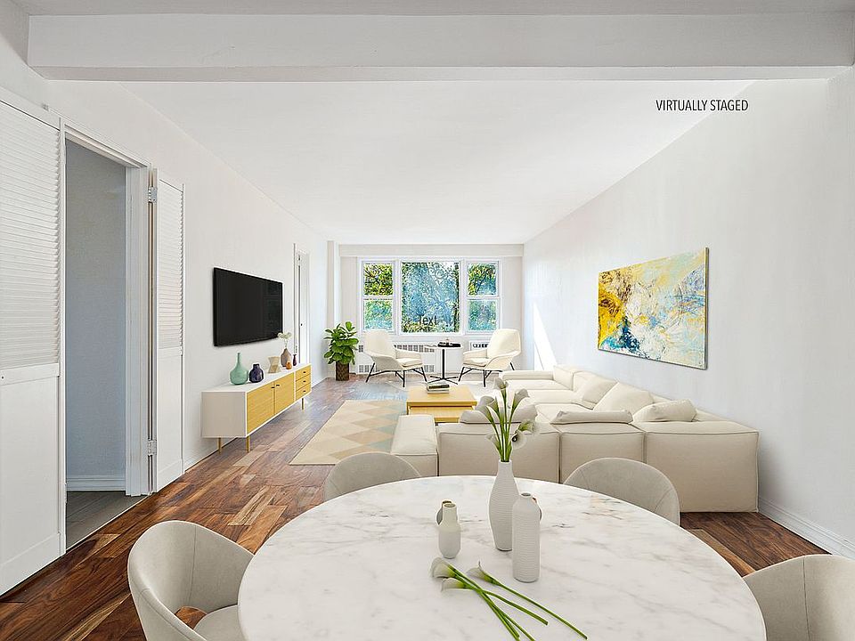 A Must See! Enjoy the tree top views from this renovated corner unit in Kensington's well sought after Park Towers. Located at 370 Ocean Pkwy, just off Cortelyou Rd, this spacious 1100 sqft, 2 bedroom unit enjoys all day sun from it's southern and western views. The large over sized living room flows into a large dining area, perfect for entertaining. There is a separate modern eat-in-kitchen with a window. It features stainless appliances including a dishwasher, quartz counters and plenty of storage. The master bedroom is king size and the 2nd bedroom has room for a queen and has direct access to the private terrace. The renovated modern bathroom is bright and clean with white tile. The apartment has new hardwood floors throughout and generous closets including a walk-in at the entrance.