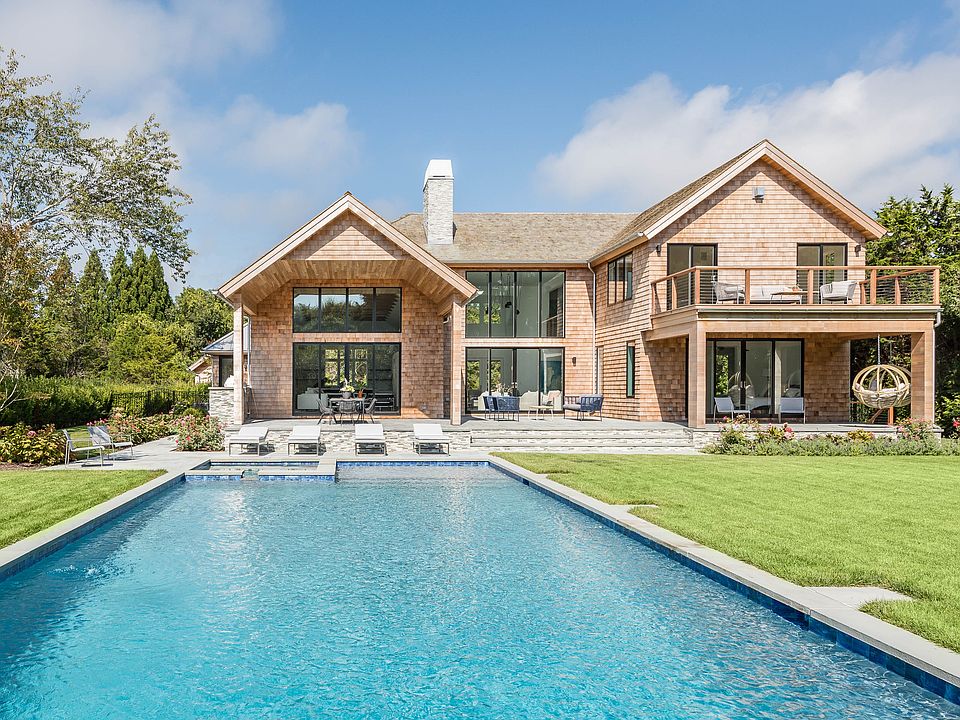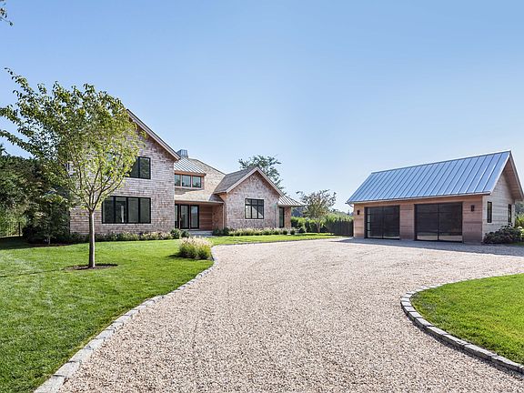 Hidden down a 550' long private driveway, well south of the highway, sits this designer caliber new build that has just been completed and is the next great deal in East Hampton South. Nestled among some of the most expensive homes in the country this authentically barn style façade, clad in a mix of shingled & rift-cut clear cedar, gives way to a truly modern interior. Sited facing due south on a lot with grandfathered 100% clearing this lot is second to none. A grand entrance greets you as you enter with vaulted ceilings and walls of glass that bring the outside in. The great room is anchored by a grand fireplace with custom cedar mantle. The open entertaining area flows seamlessly into the 'barn room' with soaring ceilings and beautiful beams. This space is centered around a large eat-in kitchen with a beautiful calacutta marble backsplash and two large islands as well as a wet bar with an additional sink, ice maker and wine fridge. High-end appliances, custom cabinet drawers, double dishwashers, open walnut shelves and top-of-the-line designer finishes make this kitchen truly world class. Flanking the kitchen is a large dining area and family room with an oversized wood-burning fireplace. The main level showcases 2 ensuite bedrooms, including a spacious first floor master suite with walk-in closet and spa-like bath that features a walk-in shower and soaking tub. A full bathroom with access from the pool area and a main level laundry finishes off the main floor. The second level offers 2 additional ensuite bedrooms, including a beautiful second floor master suite complete with exposed beams, the home's third fireplace, a walk-in closet and a private mahogany deck. The sleek upstairs master bath features an oversized shower, fully tiled walls, double vanity and designer fixtures. The full walk out lower level adds a lot of square footage with two additional ensuite bedrooms, a powder room, a large living/media room and a home theatre. Outside the 20x50 heated gunite pool with sun shelf and spa beckons you into this outdoor oasis with open field views and beautiful specimen plantings. The generous bluestone patios are highlighted both covered and uncovered living areas. Enjoy views of nearby open property from the covered dining and full outdoor kitchen with built-in Lynx gas grill and stainless steel refrigerator and drink drawers for lazy days around the pool. Fantastically designed, flowing seamlessly from the modern interior to the summer living spaces outside and totaling over 7,000 sq. ft. of living space on three levels, this is the best new build home for the price. Conveniently located in between both East Hampton and Amagansett villages, and just one mile from a gorgeous world-class ocean beach.