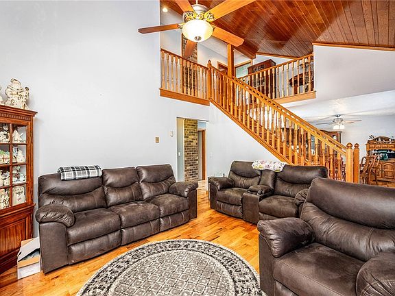 Welcome home to this amazing 3 bed|3 full bath|2 half bath all brick home on 5 acres! Walking up you will be greeted w/ a patio front porch area for sitting; inside an incredible finished basement space at ground level w/ an open-concept living room & additional kitchen, full bath, office space & storage. Upstairs you will find the main living space w/ a large 2-story living room w/ wood ceiling & hardwood floors; large eat-in kitchen open to the dining room w/ access to the backyard & a brand new second story deck with amazing views out the front; a bedroom & full bath finish off this floor. A beautiful staircase will lead you upstairs to the third floor where you will find 2 additional bedrooms & a third full bath. Outside get ready to love life with 5 acres, big deck, & party shed that features an outdoor kitchen & 1/2 bath. Additional features include 2 car garage & shop space w/ 1/2 bath & it's own entrance. This home has so much to love...you are going to want to move right in!