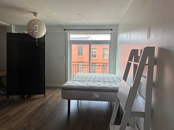 rent-stabilized, spacious studio unit is larger than some one-bedroom units. Juliette Balcony Hardwood Floors Stainless Steel Appliances Fully Tiled Bathroom Large Windows High Ceiling Virtual Doorman System Ample Cabinet Space Warm Lighting Abundant Natural Sunlight The building itself includes: Elevator Laundry Room Trash Chute/Recycling Room on Each Floor In terms of location, the apartment is conveniently situated: A 1-2 minute walk to the JMZ subway lines at Hewes An 8-9 minute walk to the L subway line at Lorimer A few minutes' ride to Manhattan MOVE IN: AVAILABLE NOW