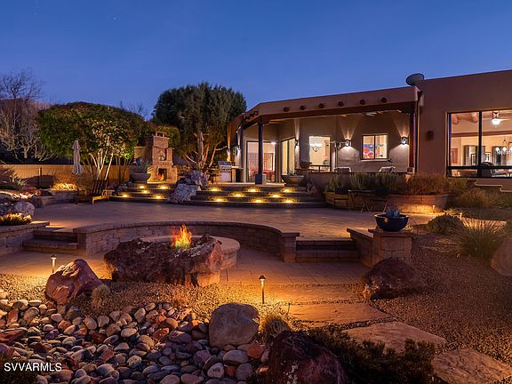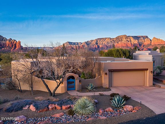 Enjoy Red Rock views inside and out of this classic Southwestern single-level custom home In the heart of West Sedona this home has a split floor plan, oversized garage, separate 330 sf artist/hobby studio with heat/AC. Enter the home via a gated courtyard which provides a shaded retreat with water feature. Red rock views dominate the living room, formal dining room, gourmet kitchen, breakfast nook and master bedroom suite. Two well-sized bedrooms are linked by a full Jack and Jill-style bathroom. Fenced backyard inspires entertaining under a covered patio with stone pizza oven, BBQ gas grill and continues enchanting via stairs or ramp leading to a stone fire pit and rock waterfall. This home has custom cabinets and finishes throughout with flagstone floors, 1/2 guest bath, awesome views.