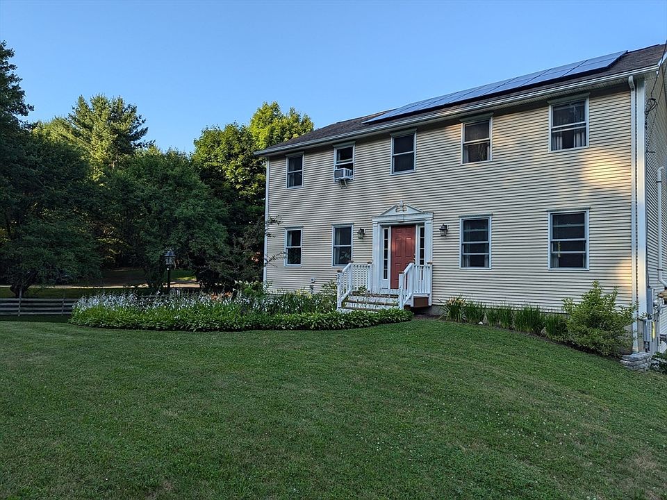 This charming 3-bedroom Colonial offers numerous updates, including owned solar panels, and engineered hardwood floors throughout the first floor. The spacious kitchen, updated lighting fixtures, and granite seamlessly flow into the dining room, perfect for entertaining. The versatile home office, originally designed as a guest bedroom, features elegant French doors that create an inviting space. Adjacent is the cozy living room, an ideal spot to unwind with a book or your favorite show. The updated downstairs bath includes a convenient laundry area. Upstairs, you'll find three generously sized bedrooms. The primary bedroom offers abundant storage and spans almost an entire side of the house, while the two additional bedrooms provide ample closet space. The basement includes a workshop, half bath, and exterior access. Outside, the large yard boasts a lovely garden area. Ideally situated near the 5 Colleges, this home is perfect for those seeking comfort, space, and convenience.