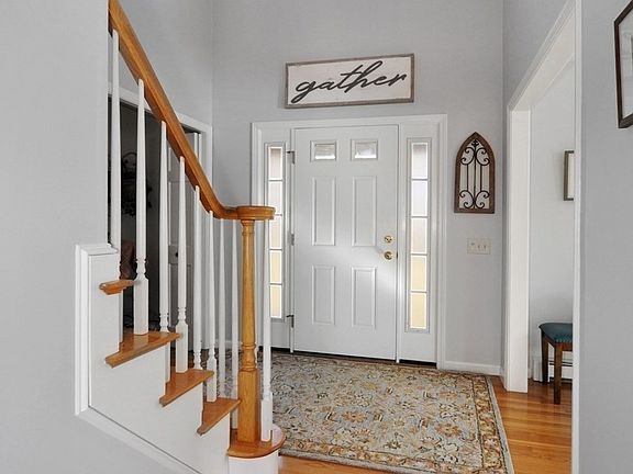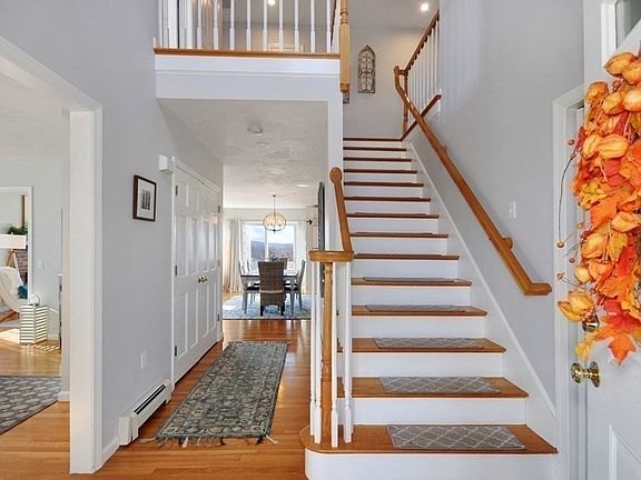 Quintessential NE Charm! It's rolling hills, Mt.views, and brilliant sunsets from this hilltop GEM! A 10 rm, 4 bdrm, 4 ba. Wood burning fireplace,and a brick hearth wood stove, finished Great Rm in ground level walkout. The main floor has a formal living Rm and dedicated home office. Tastefully decorated with bright living spaces. Upscale kitchen, new appliances open to dining and fireplace family Rm. Four bedrooms, Mst. with picture window and cathedral ceiling. All the interior has been recently painted with new carpet in bdrms, hardwood floors on first floor. Oversized mudroom and laundry. A two car oversized garage with a loft and bright work area. Manicured lawn and handsome stone wall define this special corner lot property, while blueberry and blackberry bushes produce summer delight.The private oversized new trex deck capture the western views. Close to shopping with commuter train nearby. The town center supports the schools, library and town buildings.