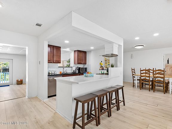 4/2/2 CONCRETE BLOCK POOL HOME BACKS UP TO CREEK! Desirable split bedroom plan offers spacious rooms with lots of natural light. The master suite boasts a luxurious en-suite bathroom, offering a peaceful oasis for relaxation. Full kitchen update with granite counter tops, cherry hardwood cabinets, stainless appliances. Venturing outside, the lush tropical fruit trees surrounding the property creates a private sanctuary. Imagine walking up to your beautiful pool area or wondering down to the creek and enjoy the views of Elbow Creek or kayak all the way into Eau Gallie River. This home is a very short drive to our beautiful river and beaches!
