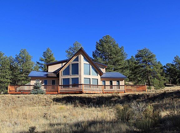 Classic Custom Colorado Chalet in the pines boasts 2 master suites, the entire 2nd floor with it's private deck is dedicated to one master suite, the other is on the main level. An added feature is the spiral staircase to the upstairs master suite. The pellet stove keeps the home warm and cozy. The prow-style front with it's huge west-facing windows bring the natural world into the feel of the home. Kitchen and baths have custom cabinetry, tile work and flooring. Hardwood floors in the living area. Exterior low maintenance stucco with metal roof. 30X30 Steel barn/garage. Pines and aspen to the back & spectacular mountain views out the large trapezoid front windows make this location about as perfect as can be. Domestic well! With 1,000 gallon cistern.