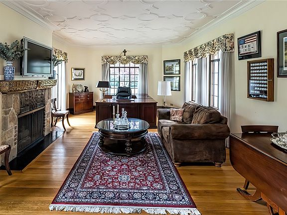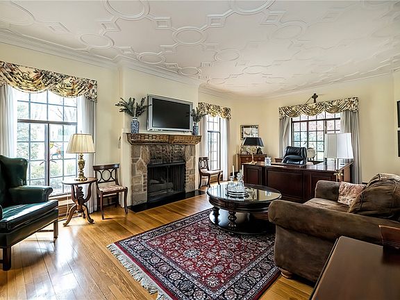 Captivating English Tudor designed by noted architect, George Stickle, with awards for historic preservation on two private, wooded lots in Glenwood w/distinctive features, hand-battered roof tiles, copper gutters, stained glass windows by John Vahanian throughout, hardwood floors, crown moldings, art niches, central hall foyer w/curved staircase, sunken living room w/decorative ceiling and gas fireplace & hand-carved mantle, oak beams & library paneling in dining room, great room addition w/fireplace, beamed cathedral ceiling & doors to private patio, wet bar in den, white kitchen w/ss appliances, breakfast room w/built ins, screened porch, stunning master suite with lighted trey ceiling, remodeled bath w/rain shower, 5th bedroom, full bath, cedar closet & storage on 3rd floor, family room w/fireplace in finished basement, 3-car garage, one w/convection heater & waterproof walls, in-ground sprinkler system. Natural oasis w/gazebo, firepit & walkways tucked in but close to everything!