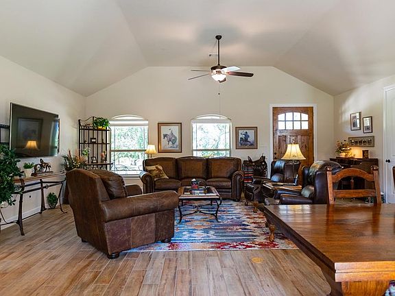 Custom 3 bed / 3ba, office, 3 car garage home on 5.84 acres in small gated community in Blanco. Home was built in 2019 & offers open concept living, tile floors & high ceilings. Fireplace in great room. Granite countertops, ss appliances, large walk-in pantry, gas cook top, penalty of cabinets and large food prep area are featured in kitchen. Tankless gas water heaters, water softener & filtration system. Large front & back porches are surrounded by beautiful landscaping & huge oak trees. Property has been cleared, fenced and has a 40'x60' metal workshop w/ lots of storage.
