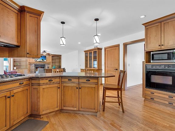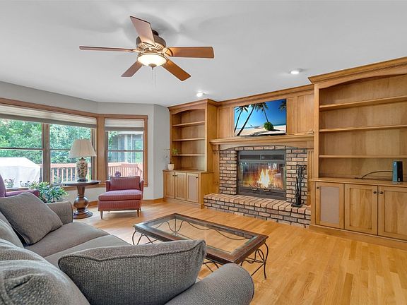 The gourmet kitchen features custom cabinets, quartz countertops, and an abundance of cabinetry, including a built-in dining hutch and breakfast bar. The open-concept kitchen and great room area, adorned with custom built-ins surrounding the fireplace, is perfect for entertaining. A main floor suite is handicap accessible, boasting a walk-in shower and a wall of built-ins, and offers direct access to a deck for private relaxation.