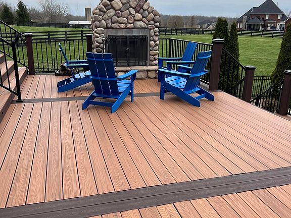 Spectacular Multi-tiered TREX deck with outdoor stone fireplace and solar lights. Plenty of