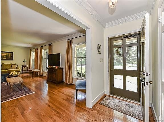 Centrally located between Uptown and Ballantyne, this home at SouthPark offers easy accessibility to all business districts. The strong schools are walkable. There is an optional swim and tennis club in the neighborhood. The corner lot with a side entry garage has a beautiful, level, private backyard. The stone patio is ideal for relaxing or entertaining. Hardwood floors, dentil crown molding, white kitchen cabinets, gas cook top, new dishwasher, and farm sink bring style. The master bath with separate tub and shower, dual sinks, and good closet space bring value. The updated hall bath, finished sunroom with potential for a drop zone bring updates and convenience. Dining chandelier does not convey.