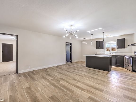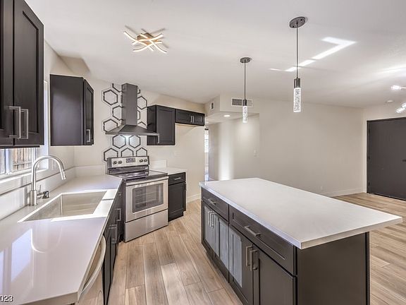 Newly remodeled, single-story, with 5 bedrooms, NO HOA and small RV parking! Quick access to interstate 93, minutes from Nellis AFB and the entertainment, casinos and shopping of downtown Las Vegas! Custom kitchen with garden view, new cabinets and counter tops, modern backsplash, stainless-steel appliances and island. Bathrooms have been fully upgraded with high-end shower systems, new vanities with framed mirrors, lighting, and modern tiled showers with niche. Home has gorgeous interior finishes, modern light fixtures, painted accent walls, laminate wood flooring and plush carpet throughout.