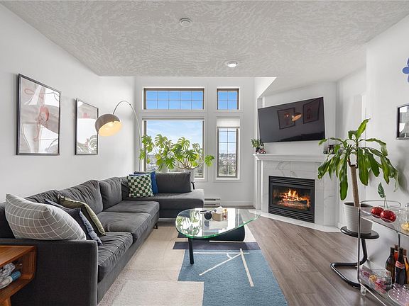 This updated 2-bed, 2-bath top floor condo offers modern living in a prime location near Uptown & The Galloping Goose Trail. Vaulted ceilings, skylights, and expansive windows fill the space with natural light while showcasing breathtaking views of the Olympic Mountains, and the city skyline. Enjoy stylish updates throughout, including laminate flooring, sleek lighting & soft-close kitchen cabinetry with granite countertops, and refreshed bathrooms. The primary bedroom boasts a walk-in closet and ensuite with walk-in shower, while the second bedroom is generously sized. Perfect for young families or downsizers, with excellent walkability to shopping, dining & transit. Cozy up by the gas fireplace or entertain on your private balcony. In-suite laundry & ample storage complete this move-in-ready home. Don’t miss this incredible opportunity!