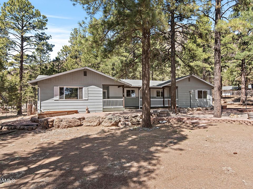 Mt Elden towers above on this almost 2 Acre lot within City Limits. This beautiful 5 bedroom sits on a heavily treed, fully fenced lot, with magnificent views! The peaceful front porch is great for relaxing and enjoying a book or coffee. The huge 35X25 ft steel frame garage has 10ft high by 12 ft wide doors and can handle all of your projects. This property has no HOA, allows horses and other animals, could have a guest house added, or could be set up for short term rentals. Additional 500 sq ft heated basement/craft room/bonus area is not included in the sq footage. Need privacy with convenient access to shopping and other amenities? Do you want to work from home in a remote nook of Flagstaff? Ready to explore Mt Elden's endless trails right out of your property? Opportunity calls!